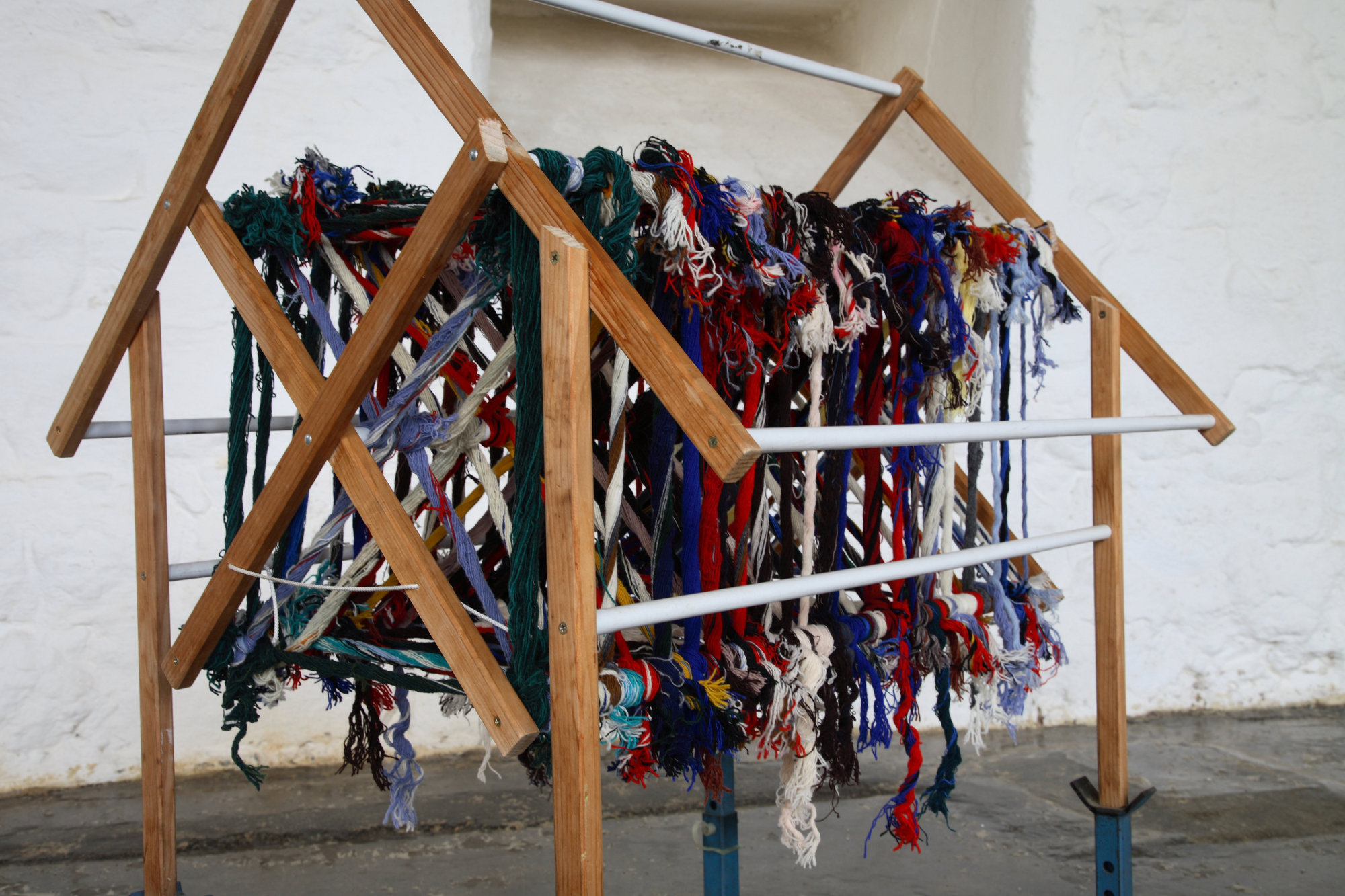 General comment from the public: Was the wool unravelled for Housewarmingthe Onkaparinga Woollen Mills in South Australai before it shut down. This wool came off the ends of blankets after the end tassels were twisted. They were all short lengths of different colours. I used our broken clothes drying rack made into the shape of a house as a frame. I think the car stands look like the supports needed under some houses.